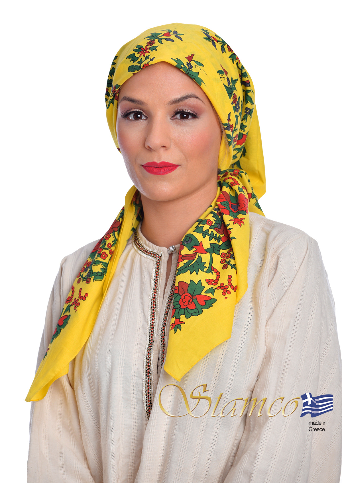 Folklore Traditional Cotton yellow Scarf with printed flowers from Petrota - Thrace.